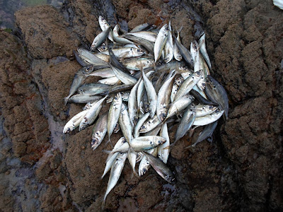 Foi sem stress que aceitou, preparei um balde de engodo, estiquei a cana, para isco uns lombos de sardinha meia moída, que já tinham ido ao mar 2 vezes, como não tinha mais nada em casa, tinha de me desenrascar com esta.